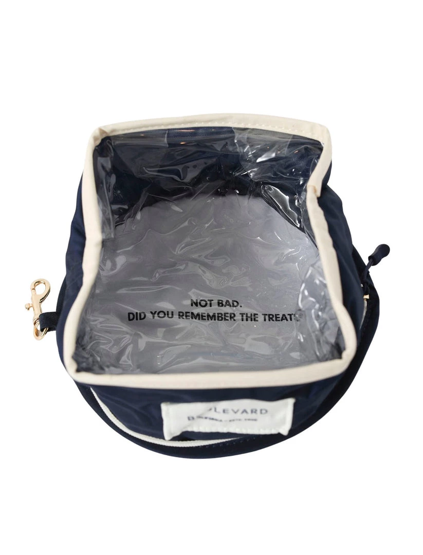 Travel navy Seaside dog water bowl. Waterproof lining. Easy to carry with clip to attach to leash, keychain, or bag.
