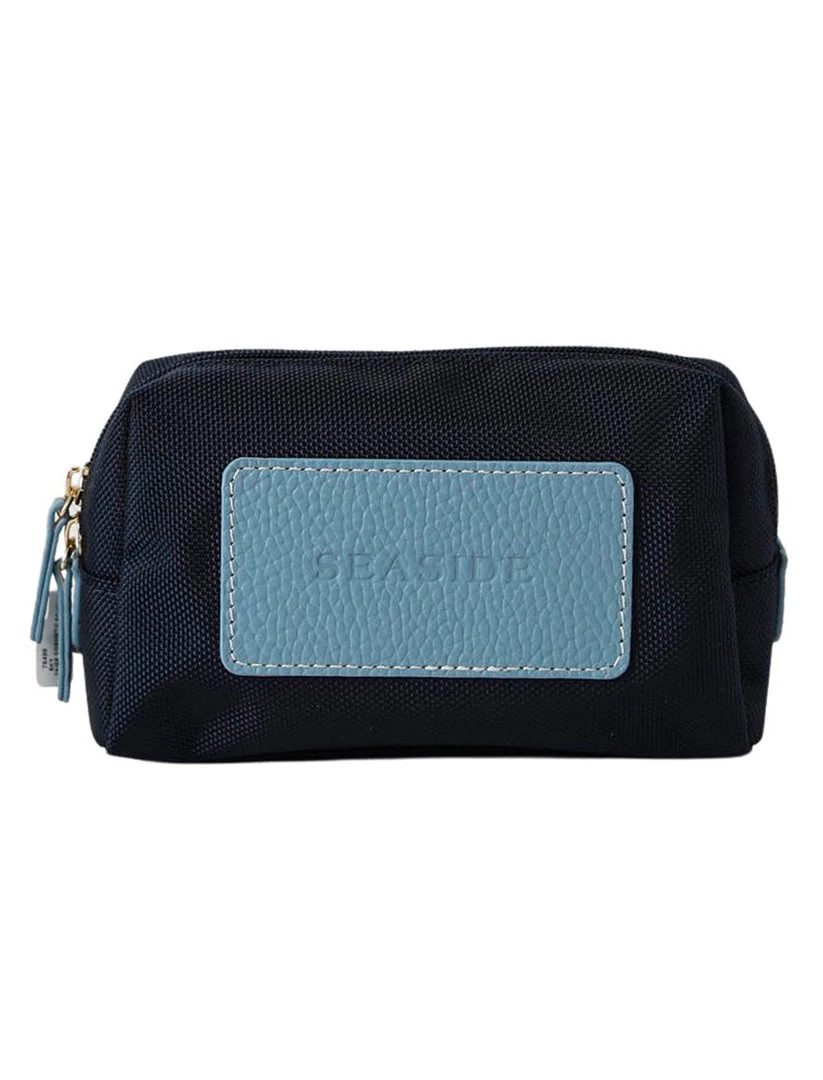 Navy Seaside Cosmetic Pouch. Nylon with a leather patch. Wide zip-top opening. Patterned lining.