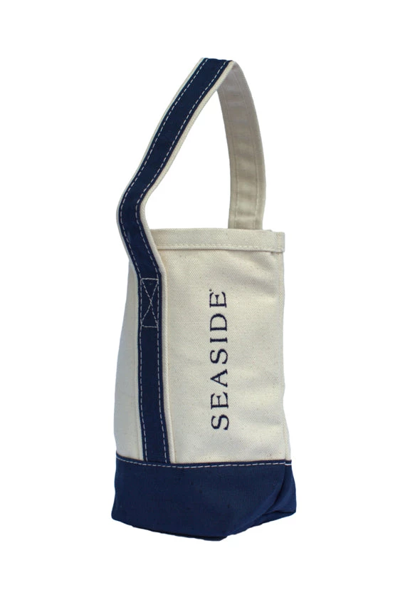 Tote your favorite wines to your next family function or outdoor concert with this natural canvas two bottle Wine Tote with contrasting navy trim. Perfect for any BYOB event or a great housewarming gift, this bag includes a detachable velcro divider.